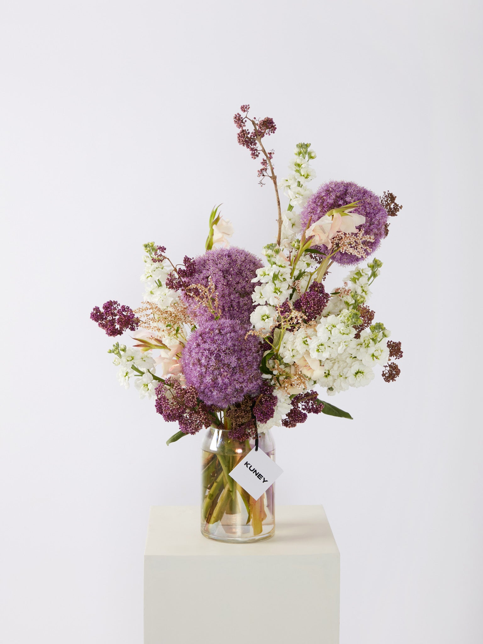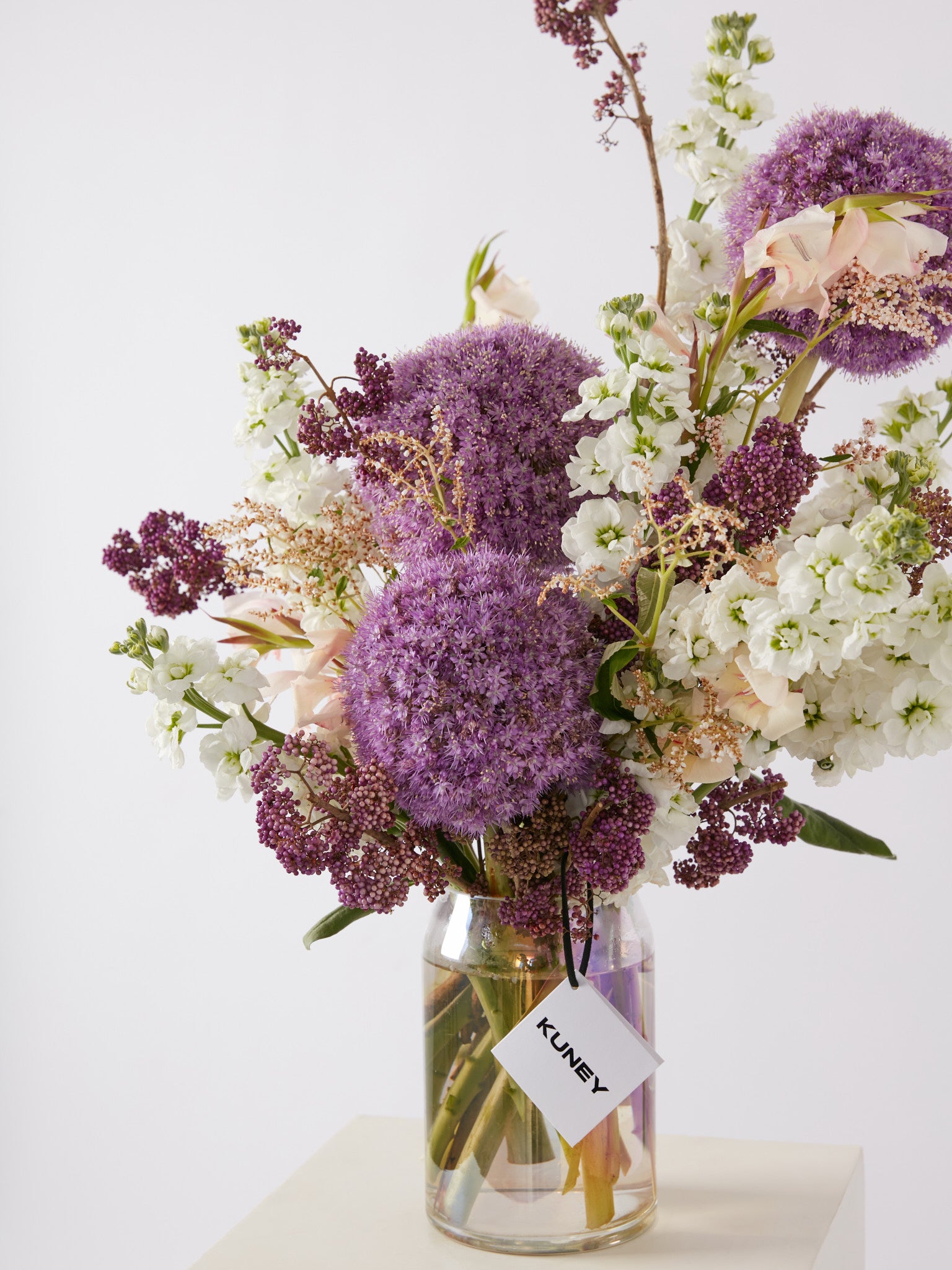 大花蔥襯以白絨紫羅蘭。特別的花,送給特別的您。