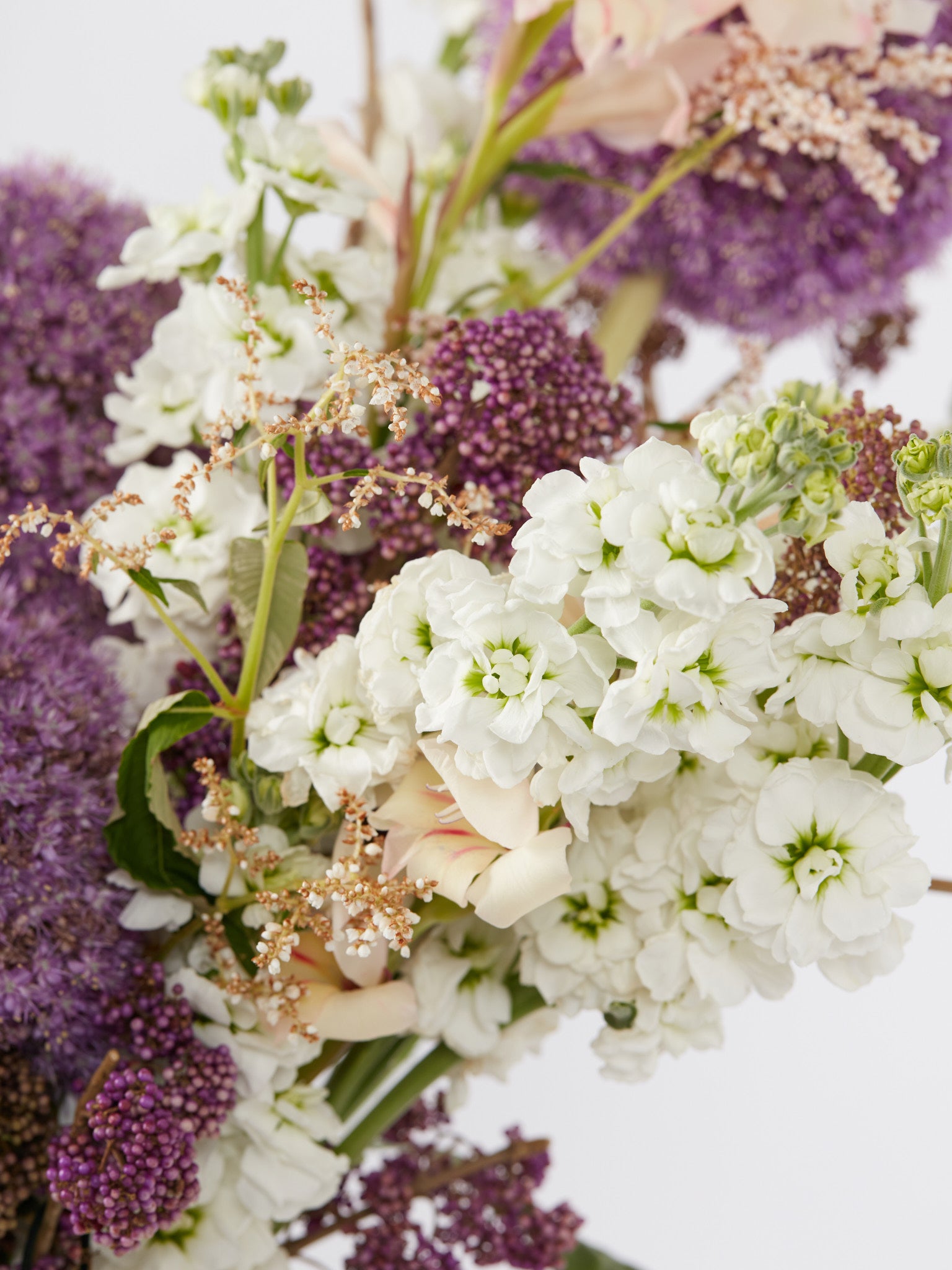 Pairing allium giganteum and white fluffy matthiola, with a textural mix of complimentary flowers and foliages.